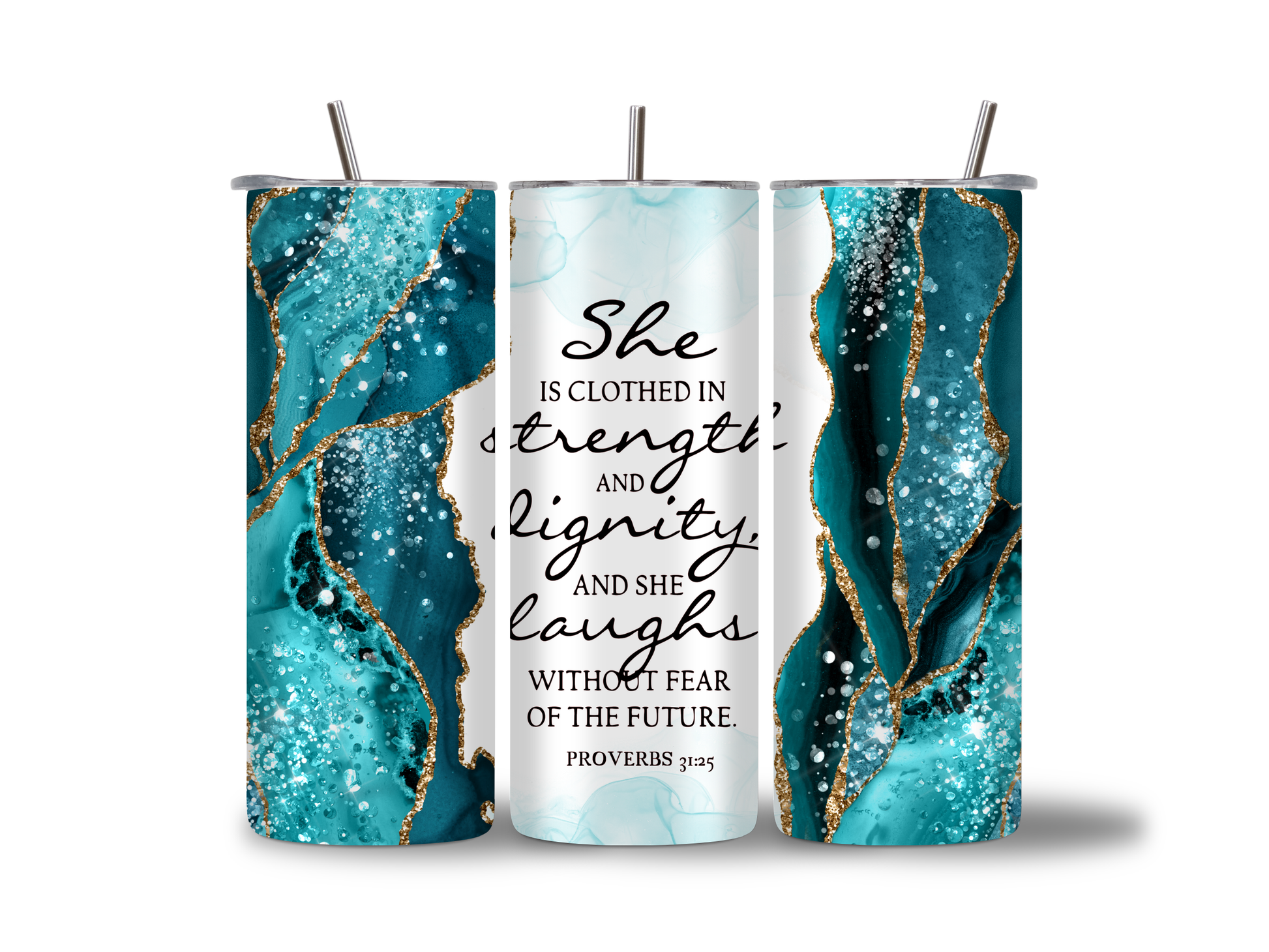 This 20 oz tumbler combines premium stainless steel durability with elegant marble and gold accents, featuring the uplifting Proverbs 31:25 message: "Clothed in strength and dignity, she laughs without fear." It's a beautiful, meaningful gift perfect for inspiring daily confidence. Make it truly unique by adding a custom name for that extra special touch. Durable, stylish, and deeply empowering, this tumbler is designed to accompany and motivate her throughout every day.
